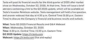 ستنشر Tesla نتائجها المالية للربع الثالث من عام 2025 بعد إغلاق السوق يوم الأربعاء 22 أكتوبر 2025 وستعقد أيضا أسئلة وأجوبة مباشرة في ذلك اليوم في الساعة 4:30 مساء بالتوقيت المركزي (5:30 مساء بالتوقيت الشرقي) ✅