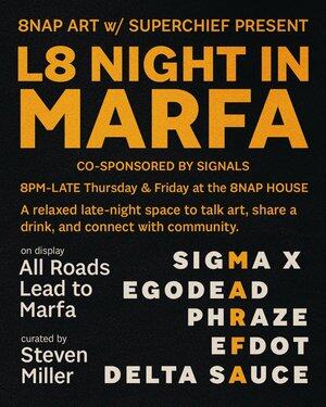 Vystaveno: All Roads Lead to Marfa, kurátorsky @SteveMiller_PHX a představuje @delta_sauce, @EfdotStudio, @egodead, @phrazebtc a @_sigmaX_. Účastníci si mohou nárokovat bezplatné edice ze sbírky a přihazovat na 1/1 díla od každého umělce.