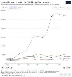 China hat mehr Roboter in der Produktion als der Rest der Welt zusammen. Unitree verkauft fortschrittliche humanoide Roboter für 5.900 $. China hat ganze "dunkle Fabriken", die ohne Menschen betrieben werden.