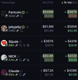 Top Pumpfun-Coins der letzten Stunde basierend auf dem Volumen: $Fartcoin $Jellyjelly $Stjude $Nick $Claude 🤖: