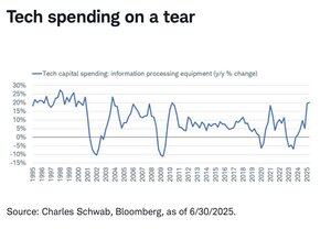 Las acciones de Mag 7 ahora representan casi el 25% del gasto de capital del S&P 500. Las acciones de los nombres impulsados por la IA han subido específicamente un 259% desde el lanzamiento de ChatGPT en noviembre de 2022, frente a una ganancia del 63% para el S&P. @KevinGordon24 @LizAnnSonders
