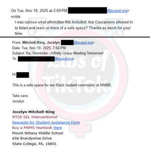 PEMBARUAN: Pejabat Sekolah Menengah Mount Nittany (@StateCollegeSD) MENGAKUI dalam email bahwa siswa kulit putih TIDAK DIIZINKAN untuk bergabung dengan "Kelompok Afinitas Hitam" berbasis ras.