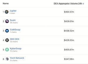 🚨更新: @JupiterExchange は、@Solana のみであるにもかかわらず、24 時間取引量ですべてのチェーンでトップの DEX アグリゲーターとして #1 の座を取り戻しました。
