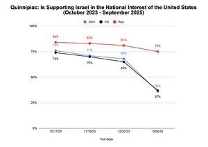 Quinnipiac: Støtter Israel i USAs nasjonale interesse: Demokratene: - Oktober 2023: 76 % - Sept 2025: 36 % (⬇️-40 %) Uavhengige: - Oktober 2023: 74 % - Sept 2025: 37 % (⬇️-37 %) Republikanerne: - Oktober 2023: 84 % - Sept 2025: 75 % (⬇️-9 %)