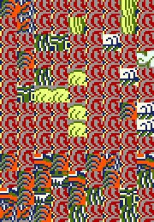 Tigerbob Charm Packs er et interaktivt animert kunstverk som dekonstruerer og setter sammen pikselkunsten min som 10x10 pikselfliser (arrays) på et større rutenett.