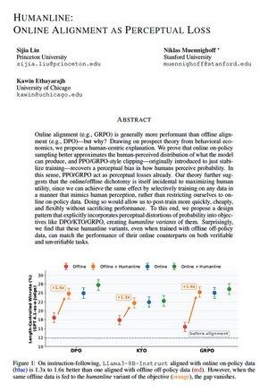 Geïnspireerd door de prospecttheorie bieden we een mensgerichte uitleg voor waarom online afstemming (bijv. GRPO) beter presteert dan offline afstemming (bijv. DPO, KTO) en tonen we empirisch aan hoe we de kloof tussen online en offline kunnen dichten met Humanline, een eenvoudig maar consistent effectief ontwerp in twee delen.