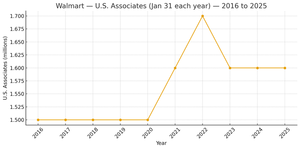 Oto pracownicy Walmart US w przybliżeniu od 2016 do 2025 roku.