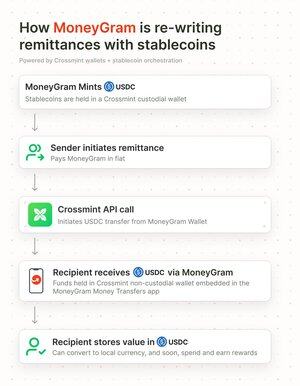 1. A MoneyGram emite @circle USDC e mantém saldos numa carteira custodial da Crossmint.