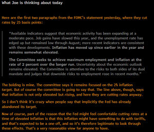 Хорошая рассылка от @TheStalwart сегодня ... что нам делать с тем, что ФРС снижает ставки, при этом заявляя, что "инфляция возросла с начала года и остается на несколько повышенном уровне" в заявлении вчера?