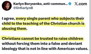 Так стверджує бездітна Карлін Борисенко, яка також називає батьків-християн «насильниками дітей» за те, що вони виховують своїх дітей у вірі.