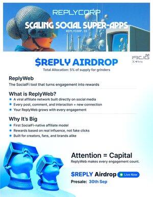 回复大家,终于可以通过 $REPLY 空投大获成功了 🫡 虽然大部分时间 Kaito 主导了讨论,但 @ReplyCorp 感觉像是下一个原始项目。 他们正在激励 CT 已经在做的事情:评论。 它为 ReplyApps 提供动力:在社交媒体动态中直接运行的病毒式社交超级应用。5.5 亿人无需下载、钱包或入门障碍即可立即使用。 它的工作原理其实很简单: ➥ 你回复/标记 @ReplyCorp ➥ 这会建立你自己的“ReplyWeb”(互动网络) ➥ 排行榜决定你在 5% 空投中的份额 ➥ 随时通过“@ReplyCorp web me”检查进度 但在后台 → 每次互动 = 积分。 积分用于购买 $REPLY → 被销毁以保持 ReplyApps 的活力。 所以循环是:评论 → 积分 → 购买+销毁 → 奖励。 P/S 明天预售,密切关注。