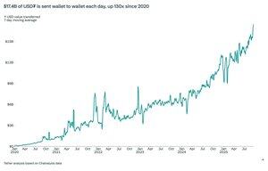 每天有170億美元的USDT在錢包之間轉移,自2020年以來增長了130倍