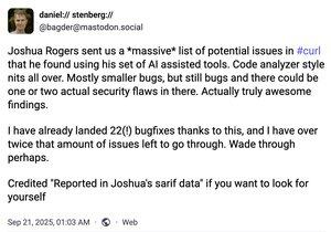Joshua Rogers 負責任且專業地使用 AI 工具,報告了 22 個以上的真實問題在 curl 中,這些問題目前正在被處理。 特別值得注意的是,因為 curl 過去曾面臨大量無效的 AI "安全問題" 垃圾信息的困擾。